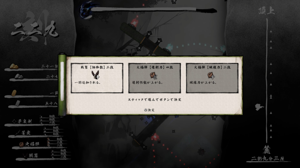 プレイヤーは、倒した魔物の魂を喰らうことで力を維持する「人外の忍者」です。ゲームプレイで得た金貨を使って装備を永続的に強化し、銀貨でその場限りの強力な「奥義の秘術」を購入。最初は太刀打ちできなかった強敵も、繰り返しのプレイと強化によって、やがて圧倒して押し返すことが可能になります。